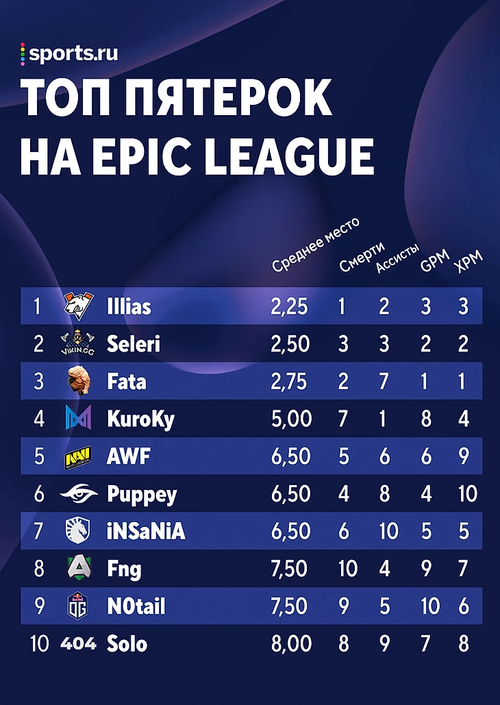 Ильяс все-таки смог обойти Seleri как в общекомандной, так и в индивидуальной таблице. На данный момент VP абсолютно по делу идут первыми. При этом постепенно налаживаются дела у KuroKy, ворвавшегося в топ-4, а также у Puppey и iNSaNiA, поднявшихся с последних строчек в середину рейтинга. И снова разочаровывает Solo: ухудшил свое место в 2 раза и стал аутсайдером рейтинга пятерок.
