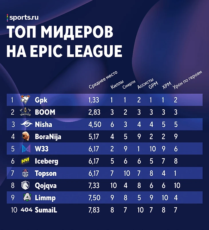 Отдельных аплодисментов заслуживает выступление Gpk: игрок Virtus.pro не только закрепился в статусе лидера, но и существенно нарастил отрыв от BOOM. В тройку лучших с 8-й строчки внезапно ворвался Nisha – прогресс Team Secret неизбежно отражается на результатах. Значительно упали Topson (с 3-4 места на 7-е) и SumaiL (с 7-й позиции на 10-ю). К сожалению, ситуация у OG и особенно у Just Error в целом неоптимальна, обе команды расположились во второй половине таблицы по итогам группового этапа.