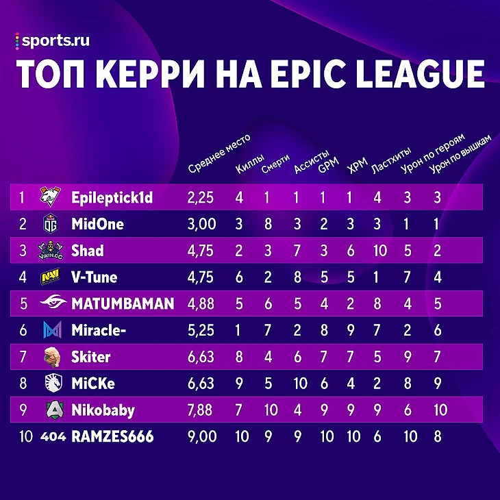 Давайте посмотрим, как изменилась статистическая картина на EPIC League Division 1. Полные версии данных доступны по ссылке. Начнем с керри.
