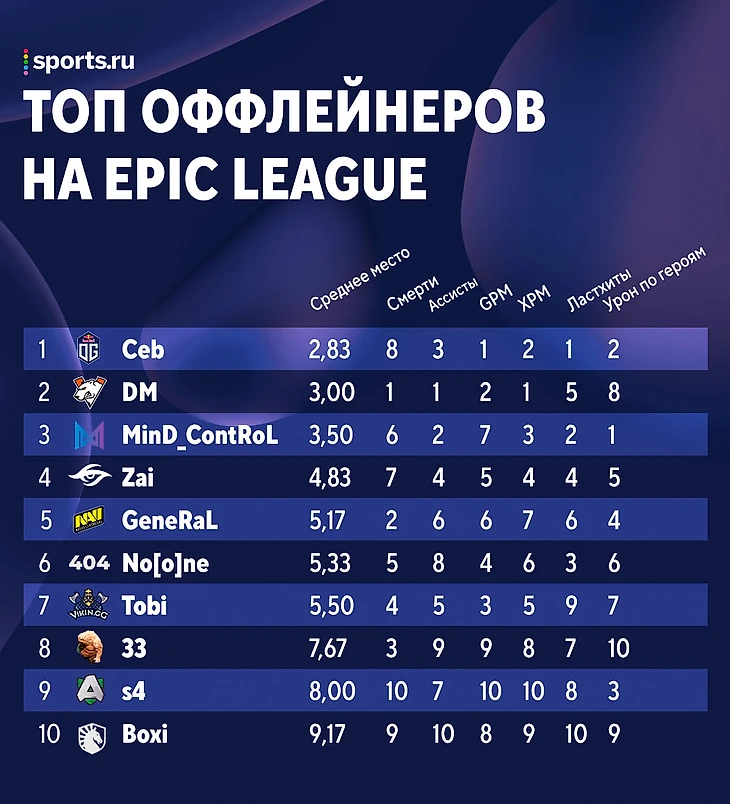Ceb продолжает лидировать, хотя к нему совсем близко подобрался DM. No[o]ne, хоть и выпал из топ-3, но остался лучшим среди игроков 404 в нашем рейтинге. Также нужно выделить рывок Zai с 9-й строчки на 4-ю – такими темпами совсем скоро мы сможем увидеть еще одного игрока Team Secret в тройке флагманов.