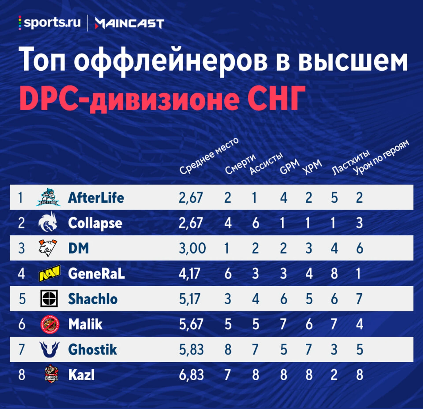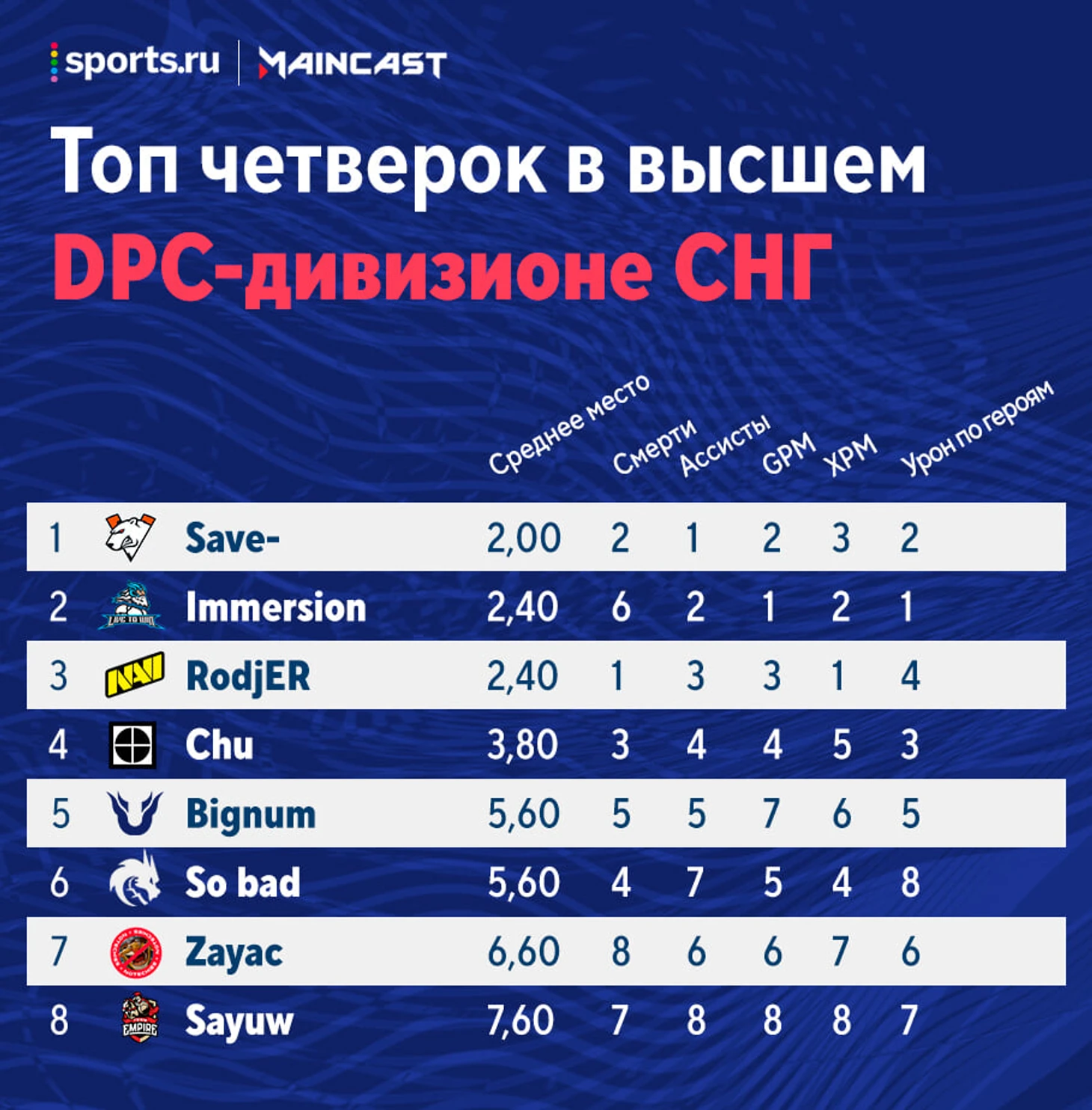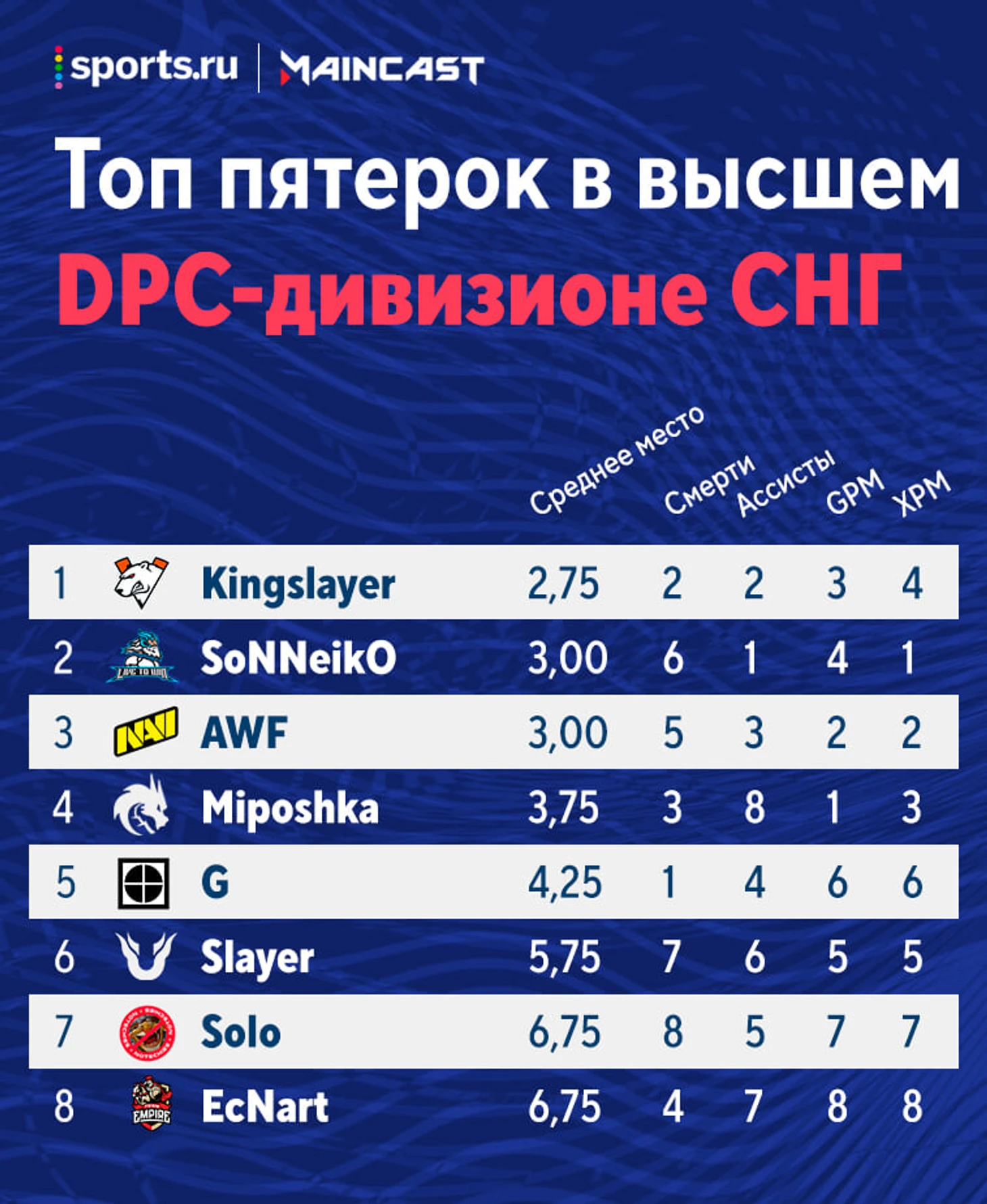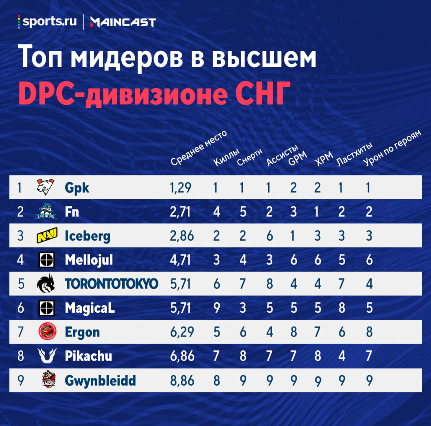 ★ Virtus.pro – хедлайнер первых матчей: все игроки, кроме DM, стали лучшими в своей роли. VP круто отыграла против Team Empire, но с большим отрывом от конкурентов пока лидирует только Гпк. Найтфолл опередил Яторо лишь по дополнительному параметру, отрыв Сейва от Иммершена и Кингслейера от Соннейко невелик, поэтому все еще может измениться.
