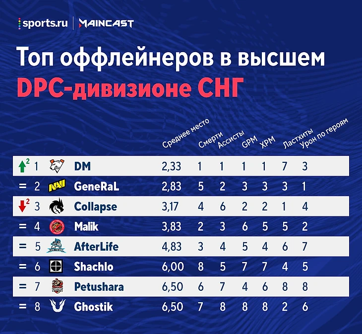 ★ У оффлейнеров поменялись местами DM и Collapse. Игрок VP ни разу не умер за две серии с Unique и EXTREMUM и показал феноменальную статистику по GPM, XPM и добиваниям к 10 минуте – в среднем на 22.3% выше нормы. Collapse же неоднозначно сыграл матч против Live to Win: всю серию умирал заметно меньше стандарта, но урон по героям на каждой из трех карт у него просел минимум на 24.2%. Сильный разброс в показателях не позволил оффлейнеру Spirit удержать лидерство в рейтинге.