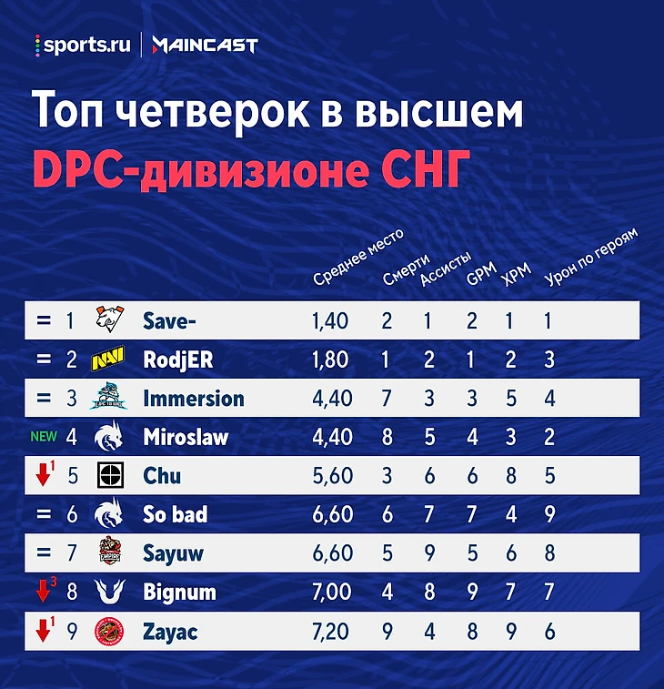 ★ Среди четверок особенно заметно падение Бигнума на три позиции. Саппорт Unique слабо отыграл против Virtus.pro: один ассист на Энигме при норме в 10 на первой карте и один ассист на MK при планке в 9 на второй карте. Его урон по героям также в три раза хуже стандарта. Из позитивного можно отметить лишь две смерти на второй карте при норме в 5.