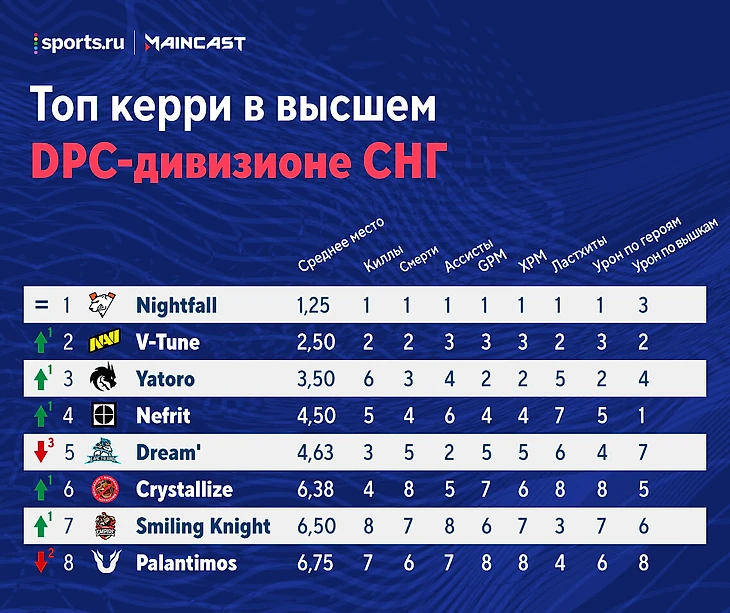 ★ В таблице керри выделяется падение Дрима на три строчки. Игрок LtW сильно отыграл на Riki на первой карте против Spirit: 24 убийства при норме в 16, 3 смерти при норме в 7, урон по вышкам почти в 3 раза больше стандартного. Но в двух оставшихся картах керри Live to Win сыграл не так круто, почти по всем показателям отстав от планки Дотабаффа. Особенно заметно Dream’ просел на Riki на третьей карте по киллам (2 фрага при норме в 8) и урону по вышкам (0 при стандарте в 2546).