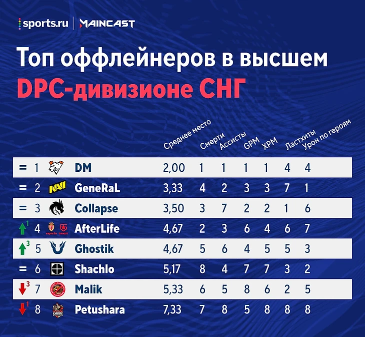 ★ У оффлейнеров в топ-5 ворвался Ghostik. Победы над NT и Team Empire заметно улучшили положение тройки Unique в рейтинге. Особенно круто Гостик отыграл на Ликане на второй карте против Империи: 0 смертей, 11 ассистов вместо обычных 10-ти и 668 XPM при стандарте в 573. На третьей игрок Unique тоже был хорош: всего одна смерть на Энигме и 11 ассистов при норме в 8. Против бывшей команды Ghostik явно выложился на максимум.