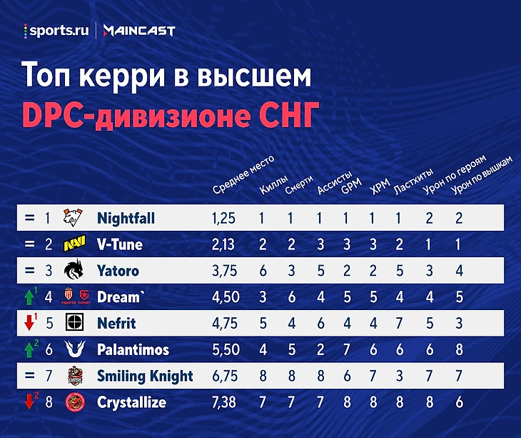 ★ В таблице керри на последнюю строчку опустился Crystallize. NoTechies провалила неделю, проиграв 0:2 Unique и 1:2 EXTREMUM. У Кристаллайза особенно выделяются две карты. Первая – стартовая против Unique, где керри NT на Riki сделал 0 киллов и нанес урона по героям и вышкам врага в 10 раз меньше нормы. Вторая – в игре против EXTREMUM с Джаггером 1-2-0 к 23-й минуте, который нанес 313 единиц урона по вышкам. Итог – последнее место как команды Соло в таблице лиги, так и Кристаллайза в нашем рейтинге.