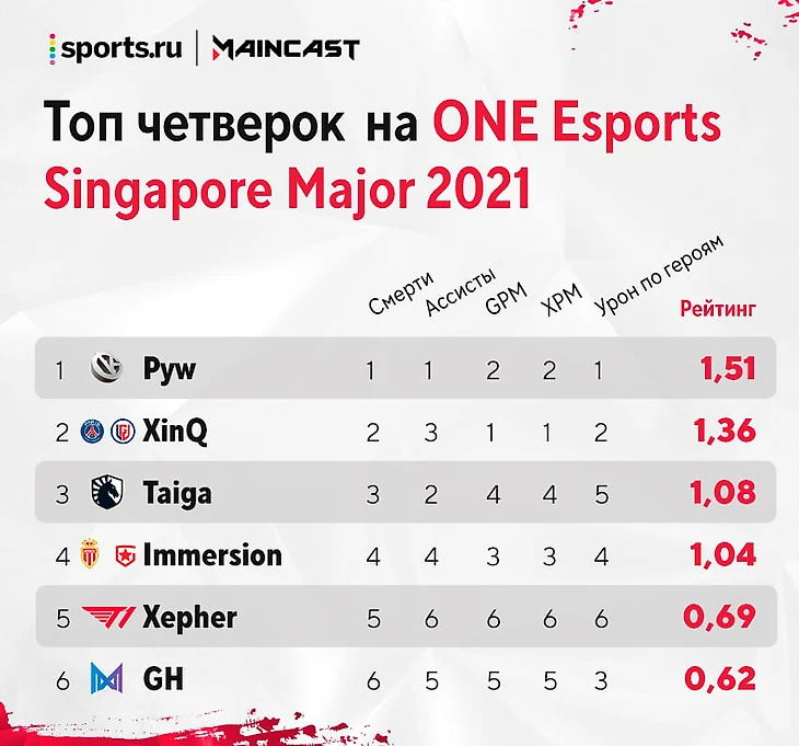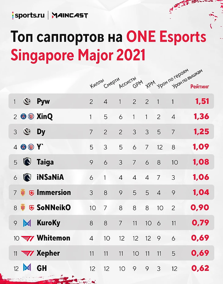 ★ Самый крутой перформанс от саппорта – Xepher на Рубике на первой карте против Nigma. 7 киллов и 27 ассистов за 27,5 минут (оба показателя примерно в 2,5 раза выше планки Дотабаффа), а также более 13 тысяч единиц урона по героям при норме в 4270. Итоговый рейтинг – 2,54.