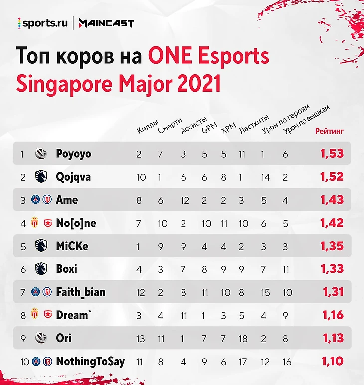 ★ Флагманы стадии – Vici Gaming: Poyoyo возглавил таблицу коров, Pyw и Dy – сильнейшая связка саппортов. Сумма рангов VG – наибольшая в Wild Card (6,51), вторая – у Liquid (6,34), третья – у PSG.LGD (6,29), четвертая – у Gambit (5,45).