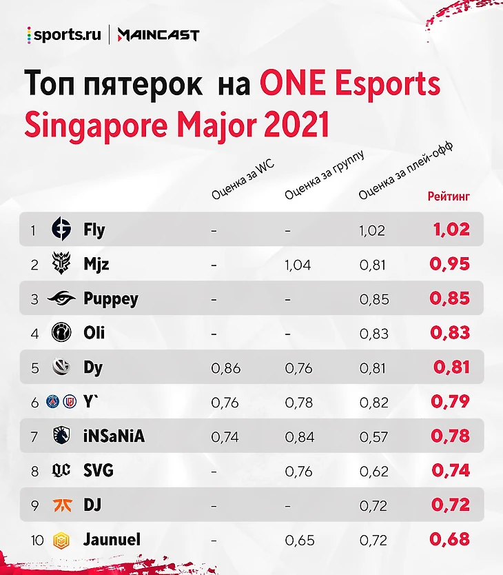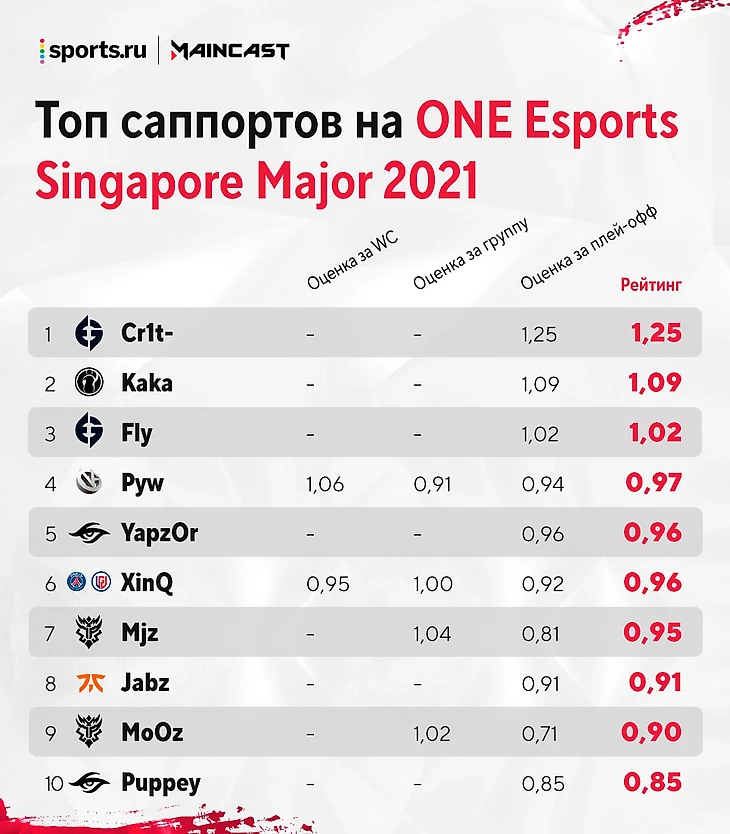 Тем не менее, Cr1t- стал лучшим саппортом мейджора, а Fly – первым среди пятерок. У Invictus Gaming стоит отметить лидера таблицы мидеров Emo и невероятного Kaka, опередившего всех, кроме четверки EG. Отдельного упоминания заслуживает герой заключительного дня – Flyfly. До матча с PSG.LGD он шел на 12-м месте в рейтинге коров, но прорвался в топ-4 благодаря блестящей игре в двух сериях. Его Spectre с KDA 14-0-18 на пятой карте – лучший перформанс гранд-финала с оценкой 1,92.