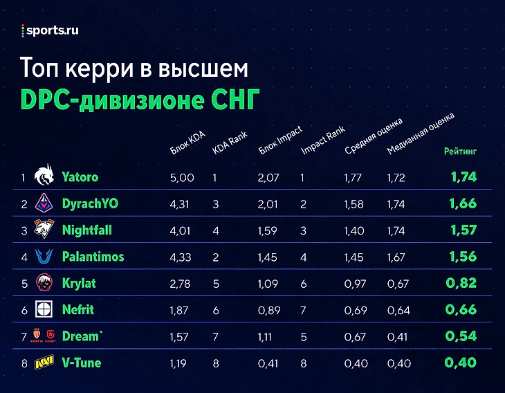 Напомним, игроки получают оценки за каждую карту на основе того, насколько они превзошли средние значения для героев в паблике от 5000 MMR. Например, если дотер делает в 2 раза больше фрагов на мидовой Лине, чем средняя Лина в центре за это же время в паблике от 5000 MMR, то его показатель киллов считаем равным 2. По итогам карты мы берем все показатели игрока, подставляем их в формулу и получаем оценку – числовое отображение качества игры. У саппортов и коров формулы отличаются. По итогам тура берется среднее значение всех оценок дотера, а также их медиана. Среднее из этих двух чисел = рейтинг игрока.