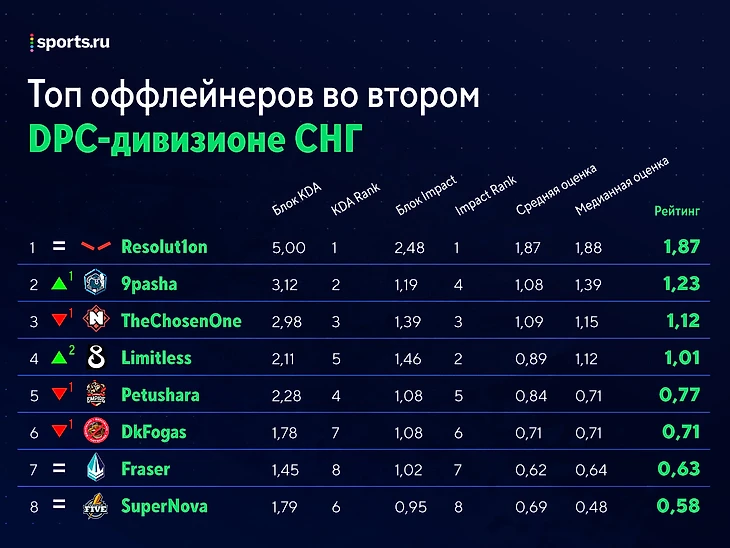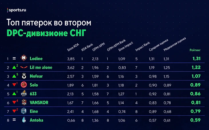 Отдельного пункта про NT нет, потому что изменений по сравнению с первым туром не так много. Ситуация в команде та же: коры играют слабо (15-е, 18-е и 20-е места из 24 в рейтинге), саппорты не так уж плохо (Соло - 9-й, Вампир - 11-й из 16). Всё сказанное в итогах 1-го тура до сих пор актуально, только показатели немного изменились. Как только появится другой тренд в цифрах, сразу напишем;)