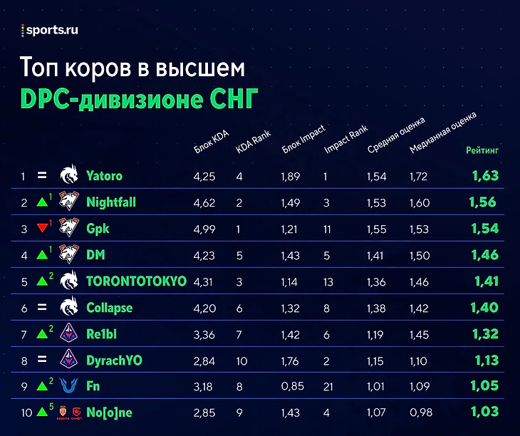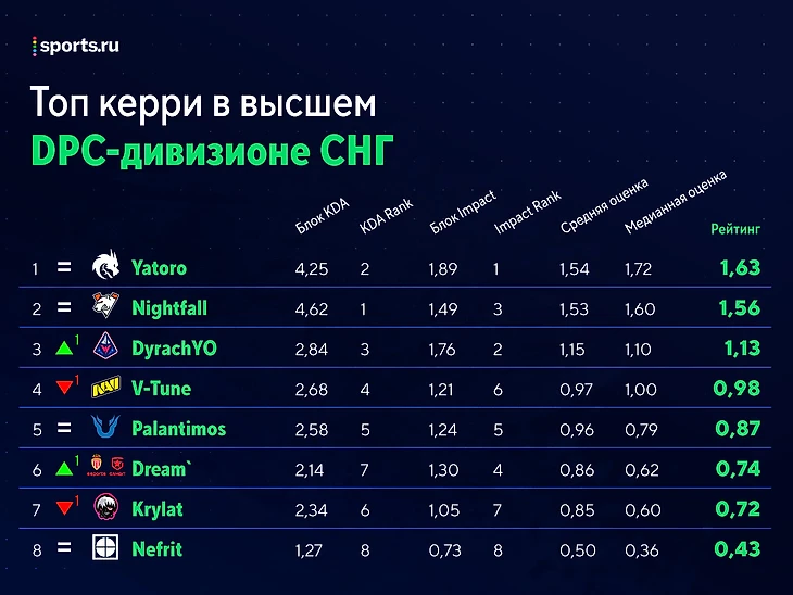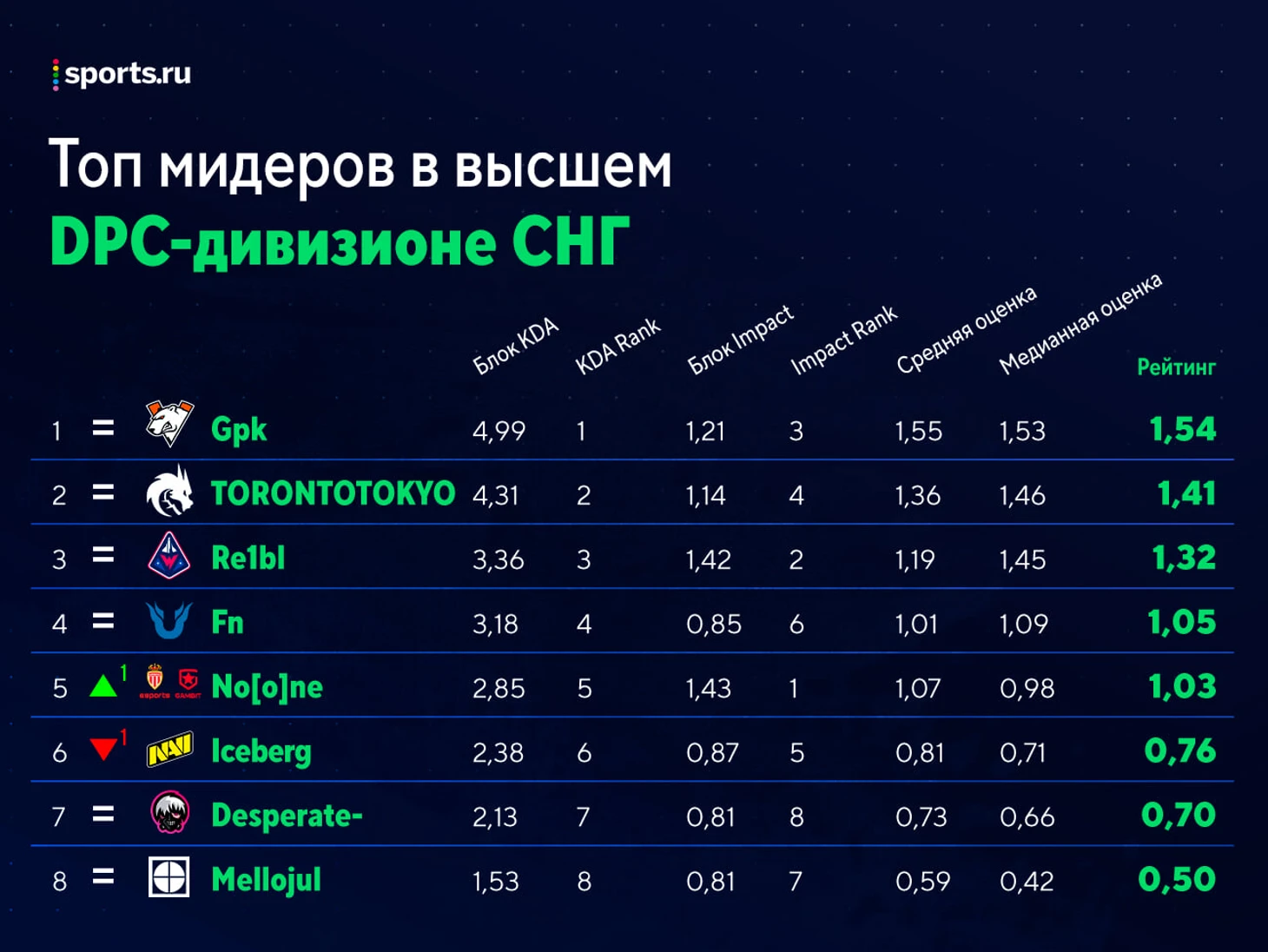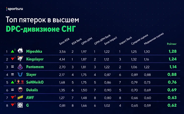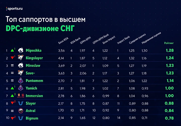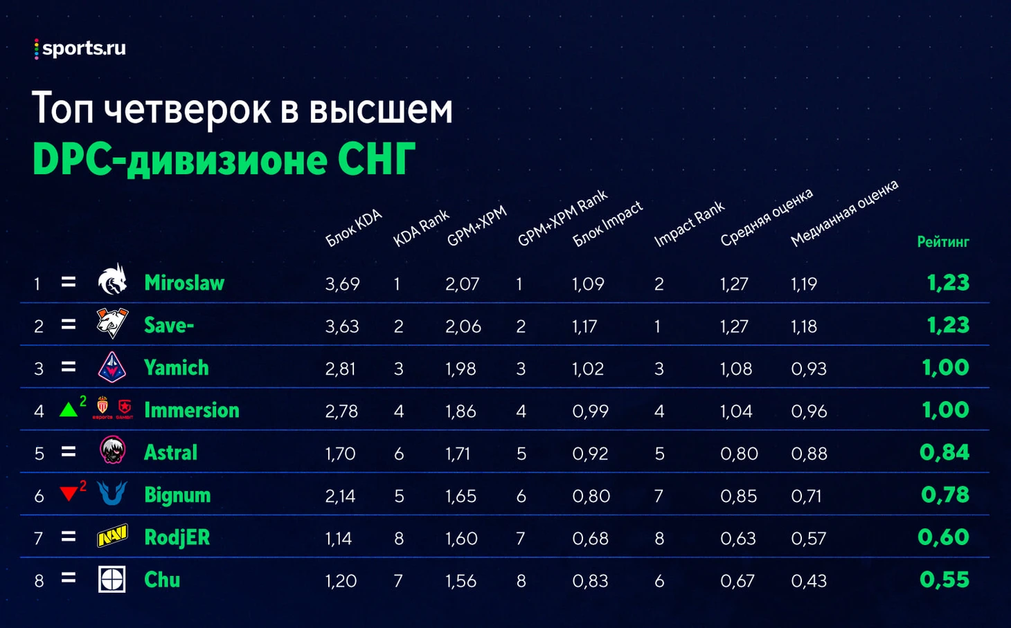 ★ Флагман тура – Spirit. Уверенная победа над PuckChamp позволила составу Сайлента остаться во главе лиги и сократить отставание от Virtus.pro по индивидуальным показателям. Теперь Miposhka – лучший саппорт дивизиона, TorontoTokyo ворвался в топ-5 коров и отыграл 0,08 у Gpk в личном зачете, а Miroslaw и Yatoro удержали лидирующие позиции. Изменения в сумме рейтингов отражают прогресс Spirit: 6,84 против 7,25 у VP тур назад и 6,94 против 7,03 сейчас. Посмотрим, догонят ли Collapse и компания команду Сейва после серии с Unique.