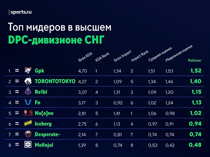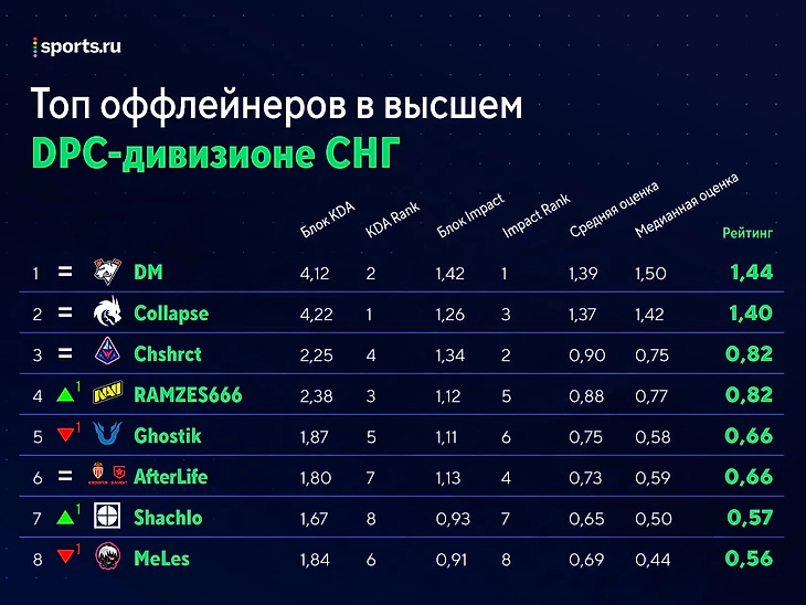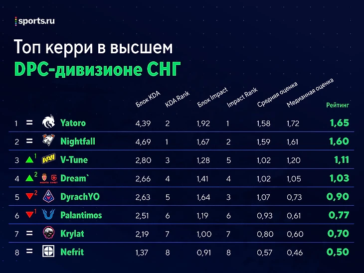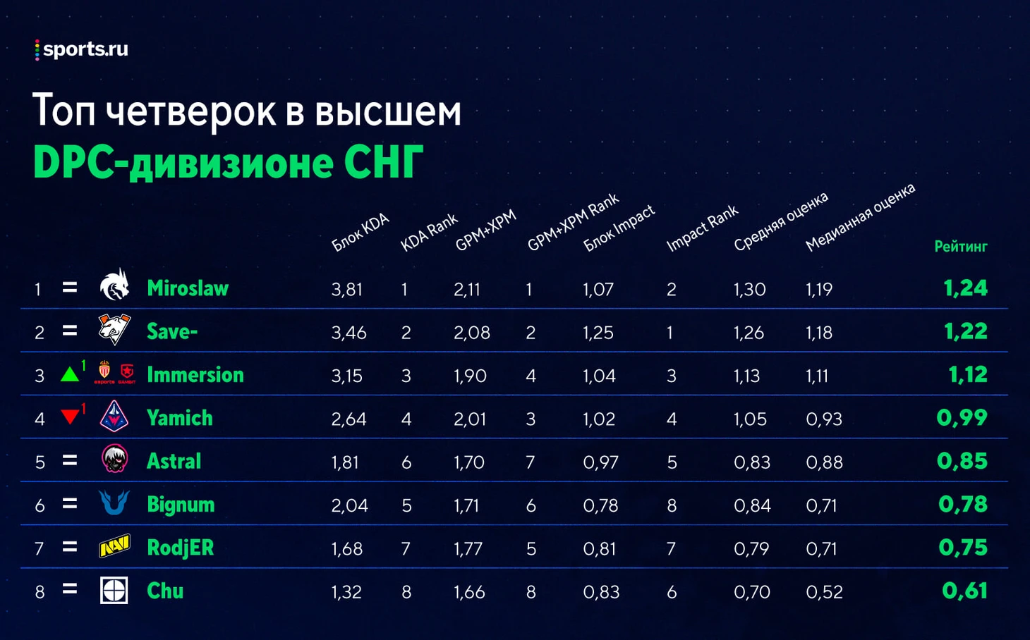 ★ Разочарование раунда - Winstrike. После 0:2 от NAVI команда Ямича почти обнулила свои шансы на мейджор (впереди еще матч с VP) и включилась в борьбу за выживание. Победа над PuckChamp спасет Пантомема и компанию, но после крутого начала чемпионата и очень близкой серии со Spirit многие поверили в Winstrike. К сожалению, стагнация по рейтингам продолжается третий тур подряд: -0,23 у Дурачье, -0,17 у Рейбла, -0,05 у Чешира, -0,01 у Ямича и -0,15 у Пантомема. Причем если оффлейнеру и саппортам удалось остаться на схожих позициях в наших таблицах, а Re1bl вообще ничего не потерял, то DyrachYO рухнул во вторую половину списка керри и на 13-ю строчку среди коров. Пока Winstrike по-прежнему третьи по сумме рейтингов, но, кажется, это ненадолго – Gambit и NAVI совсем рядом, а расписание у состава Ямича не самое простое.