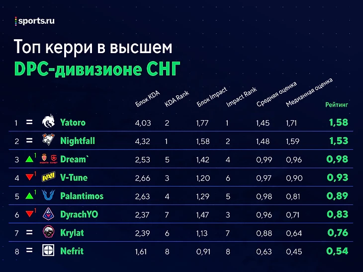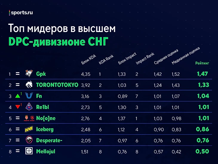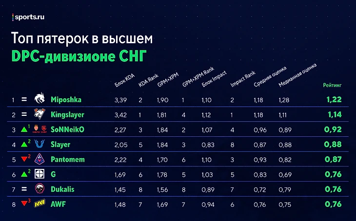 ★ Битва тура – Virtus.pro против Spirit. Три интересные карты и победа VP не слишком сильно поменяли расклады в наших таблицах, но несколько моментов стоит отметить. Во-первых, Сейв догнал и перегнал Мирослава. Отставание было невеликим – 0,02, но если отыграть эту же дистанцию у Мипошки, то капитан Virtus.pro возглавит список саппортов. Во-вторых, DM очень заметно просел и отдал позиции Коллапсу. На 0,14 рухнул индекс оффлейнера VP, и всего 0,04 потерял игрок Spirit. Итог – в топ-5 коров уже больше «драконов», чем «медведей». И, в-третьих, по сумме рейтингов Spirit обошла Virtus.pro: 6,71 против 6,67. Поскольку не очень круто сыграл не только DM, но и Kingslayer (-0,09), состав Yatoro, в котором никто не потерял больше 0,07, захватил лидерство. Понятно, что Spirit наверняка выложилась в DPC-лиге гораздо больше, чем VP, но приятно видеть еще одну молодую и интересную команду в нашем регионе.