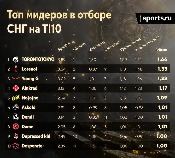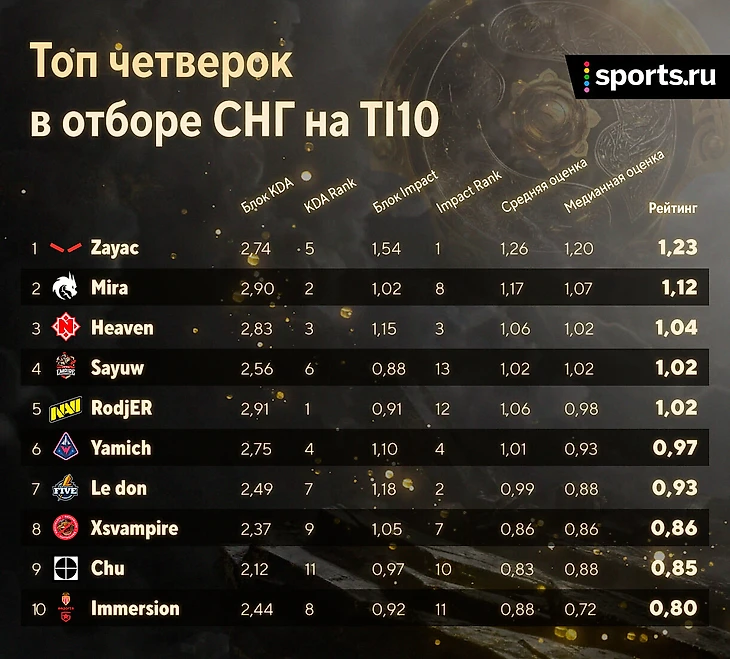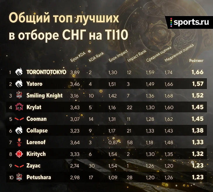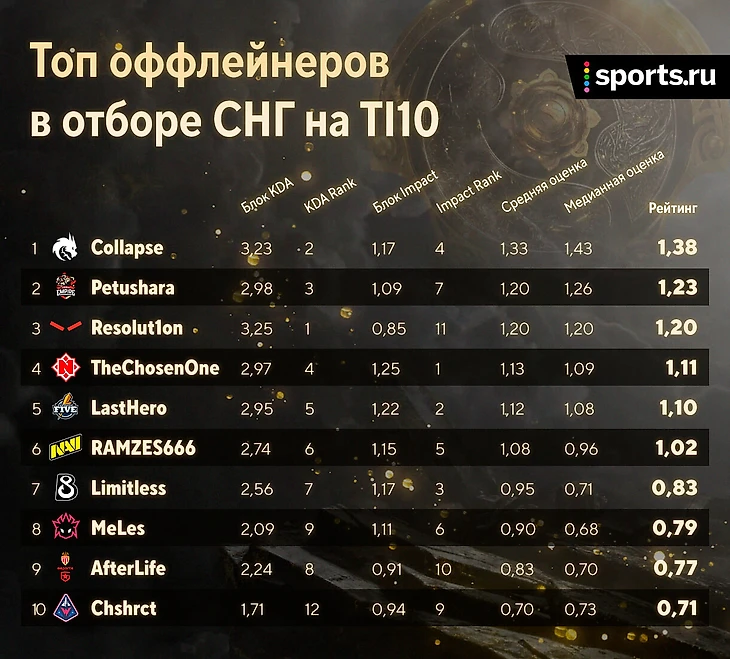 Рейтинг отбора СНГ на TI10: TorontoTokyo – MVP, Zayac – лучший саппорт, Ramzes666 ниже LastHero