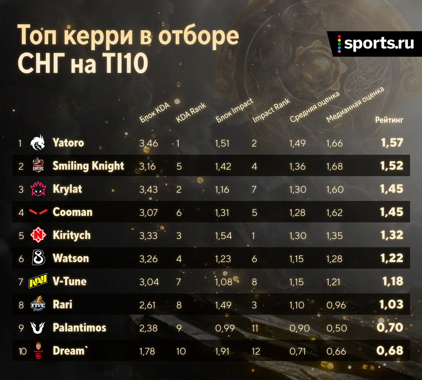 – RodjER: рейтинг – 1,02, №10 в списке саппортов, №29 среди всех игроков. Роджера превзошли четверки Империи и Немиги.