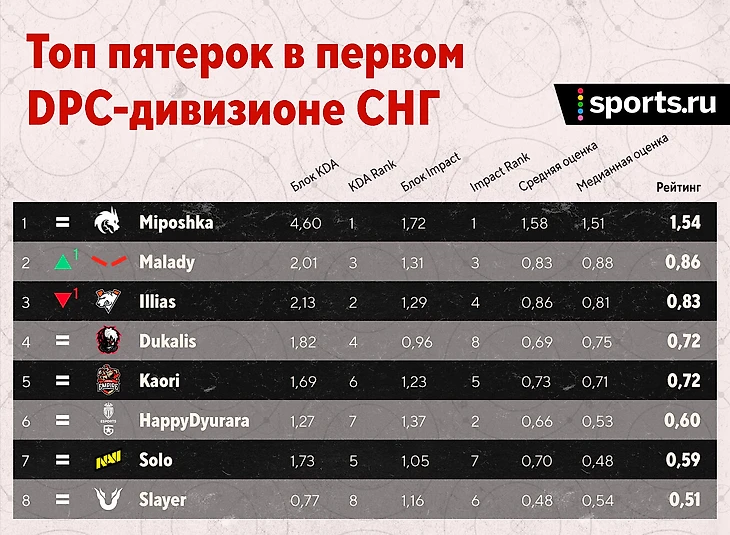 Прорыв PuckChamp – во многом заслуга успешных трансферов и невероятной формы Крылата. Крылат – лучший в команде, его рейтинг на уровне Мипошки (7-й среди всех) по итогам прошлой DPC-лиги. Young G и Malik, заменившие Десперейта и Мелеса, также ворвались в топ-10 дивизиона. Причем их рейтинги на уровне десятки лучших прошлого сезона.