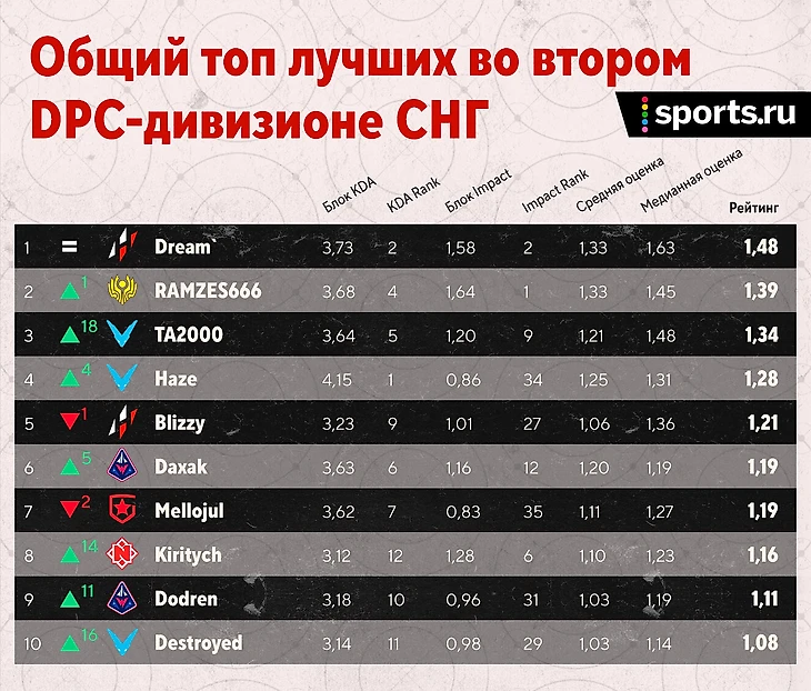 Правда, вопросы есть далеко не по всем игрокам. Mellojul и Sayuw играют отлично. Первый остается в семерке лучших в дивизионе. Второй удерживает место в топ-3 саппортов и всего на 0,04 отстает от общей 10-й строчки.