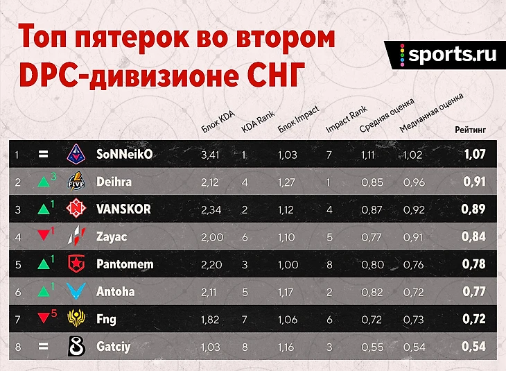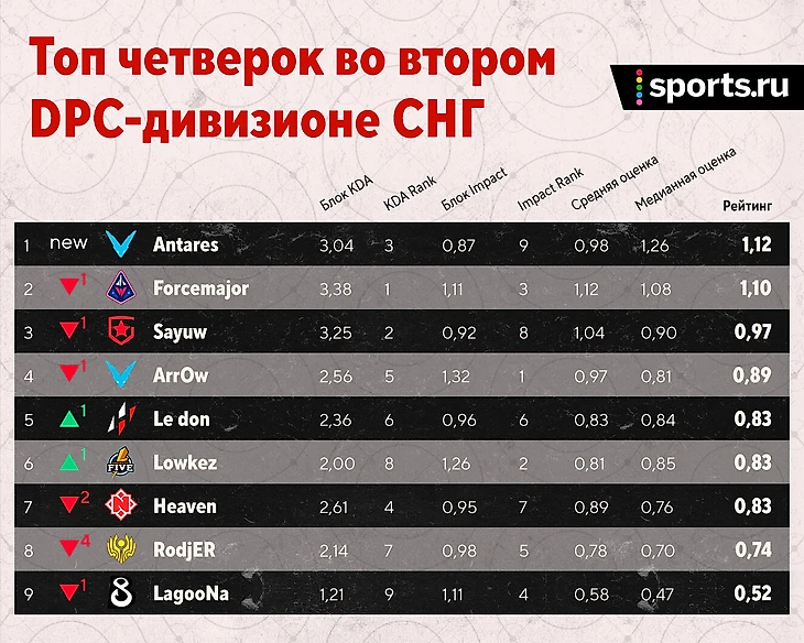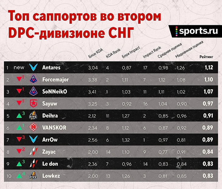 Что касается провисающих показателей Антохи: пока он входит в пятерку худших саппортов лиги. Но от средних для сапов позиций он отстает всего на 0,1. К тому же капитан V-Gaming известен своей нелюбовью к 322. Так что за честность матчей в высшем дивизионе можно не беспокоиться!