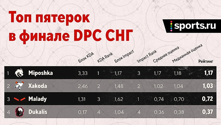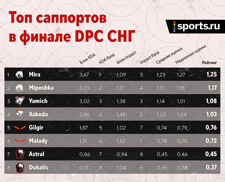 HellRaisers же развеяли сомнения относительно случайности попадания в топ-4. Re1bl cнова показал, кто лучший в HR. Ему всего 0,09 не хватило до попадания в топ-10. При этом Максим как минимум на 0,10 обогнал всех тиммейтов. Радует прогресс саппортов: в DPC-лиге Gilgir и Malady заметно отстали от своих коров. Теперь же они финишировали сразу за Рейблом. У четверки рейтинг на 0,10 ниже, а у пятерки – на 0,14.