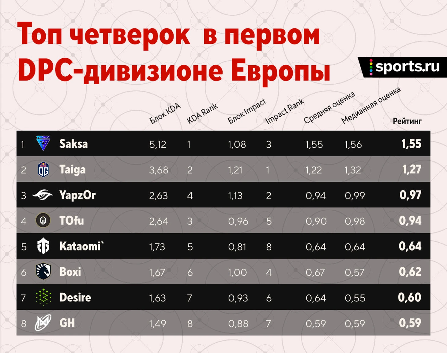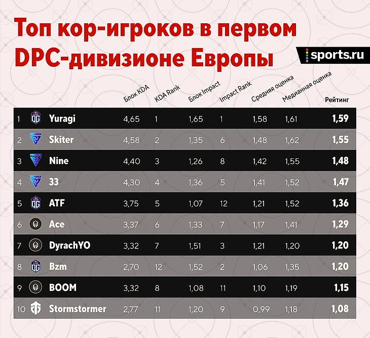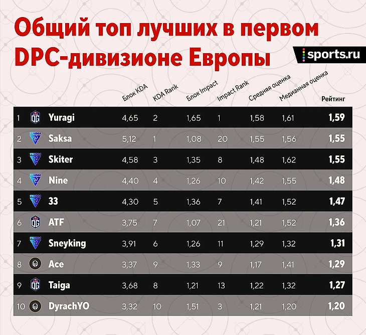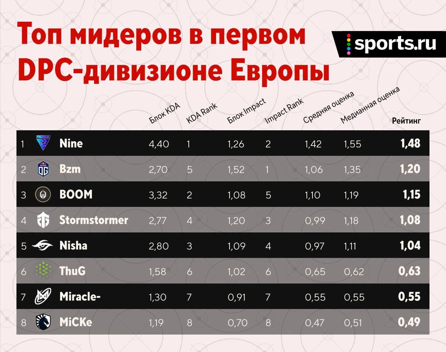 ★ OG тоже в отличной форме. Yuragi – MVP старта лиги, ATF и Taiga все еще очень хороши. При этом сильно прибавил Misha: рейтинг капитана OG вырос на 0,11 по сравнению с прошлым сезоном. Единственная проблема – немного сдал Bzm. Мидер выпал из десятки лучших, а его индекс просел на 0,14. Пока Божидар расположился на 11-й строчке в общей таблице.
