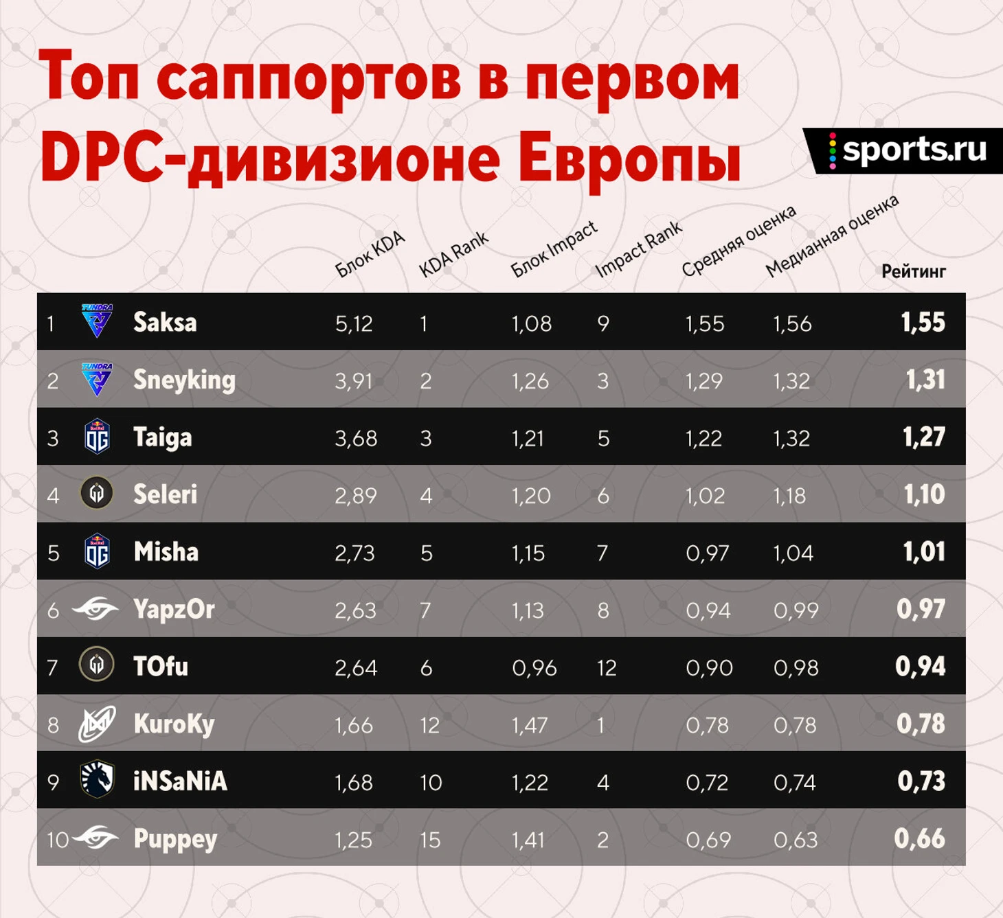 Игроки получают оценки за каждую карту на основе того, насколько они превзошли средние значения для героев в паблике от 5000 MMR. Например, если дотер делает в 2 раза больше фрагов на мидовой Лине, чем средняя Лина в центре за это же время в паблике от 5000 MMR, то его показатель киллов считаем равным 2. По итогам карты мы берем все показатели игрока, подставляем их в формулу и получаем оценку – числовое отображение качества игры. У саппортов и коров формулы отличаются. По итогам тура для каждого игрока берутся среднее значение всех оценок, а также их медиана. Среднее из двух этих чисел = рейтинг игрока.