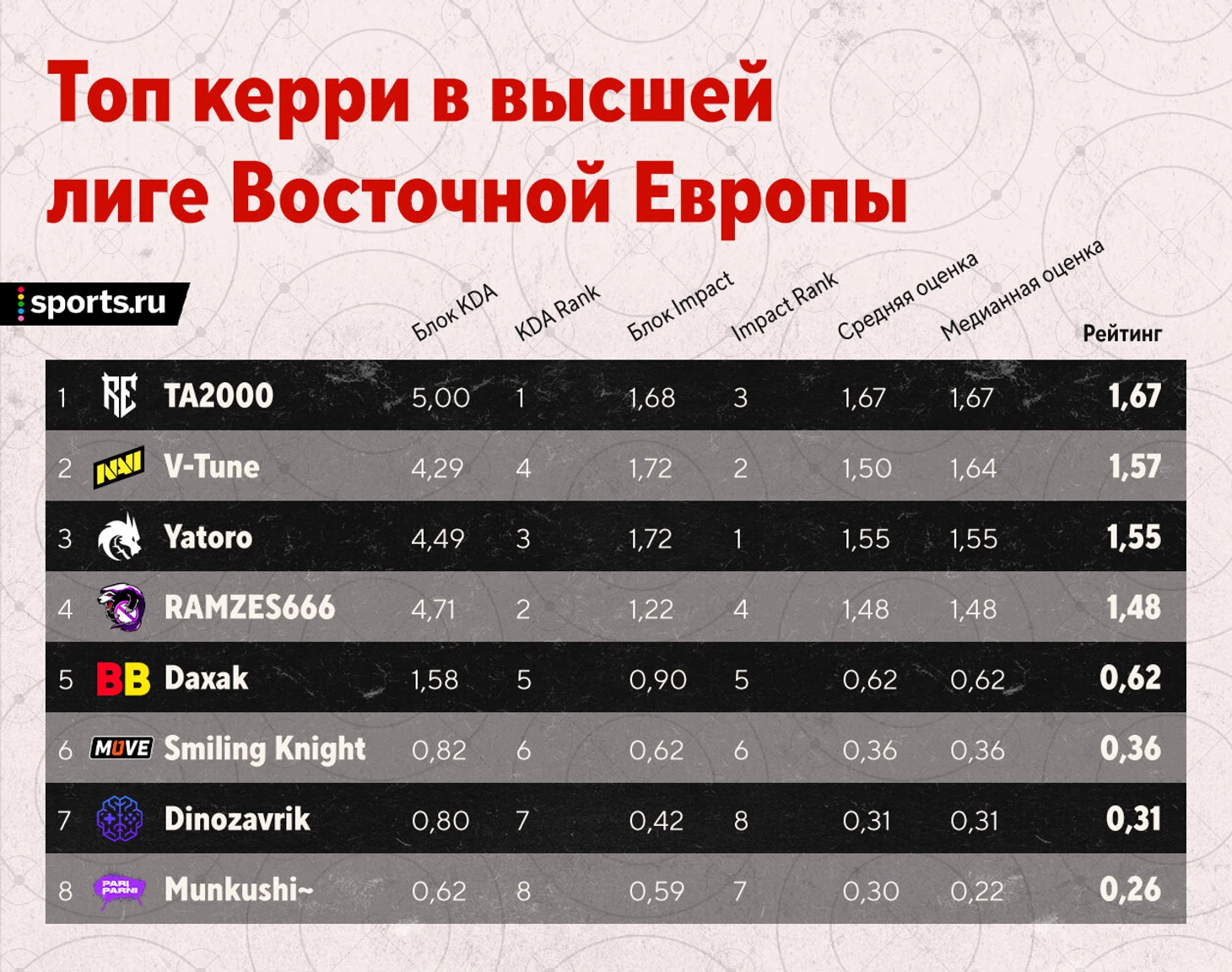 ★ У ростера Virtus.pro очень похожая ситуация. Yamich и Gpk идут в топ-3, а Ramzes666 замыкает десятку лучших. При этом совсем рядом Xakoda – №12 в общей таблице. Саппорты VP снова лучшие в лиге – ничего нового. На низкий рейтинг отыграл только DM: 0,95 и 19-я позиция среди всех игроков. Статистика Outsiders выглядит солидно, но давайте не забывать – они отыграли только против One Move.
