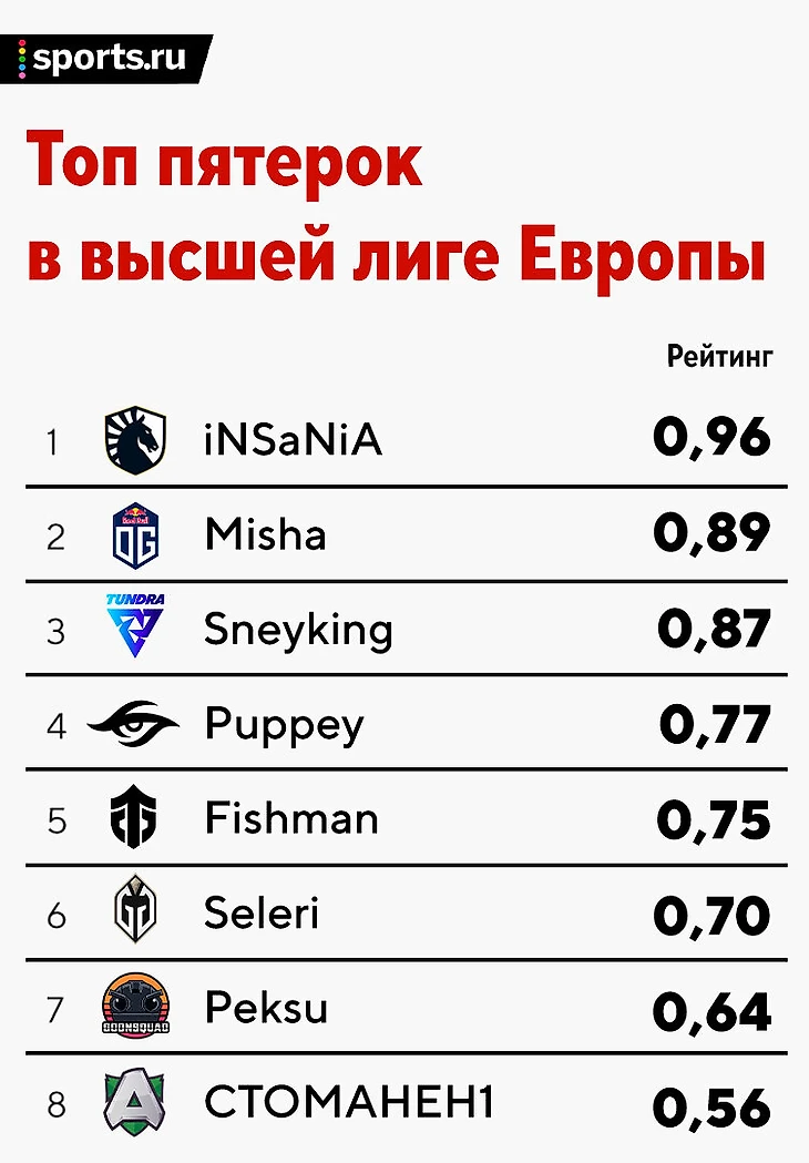 Но в целом индивидуально провисает пока только Micke. Он идет аж на 17-й строчке из 40 в общей таблице. У остальных хорошие позиции. Ждем матчей с Entity и OG.