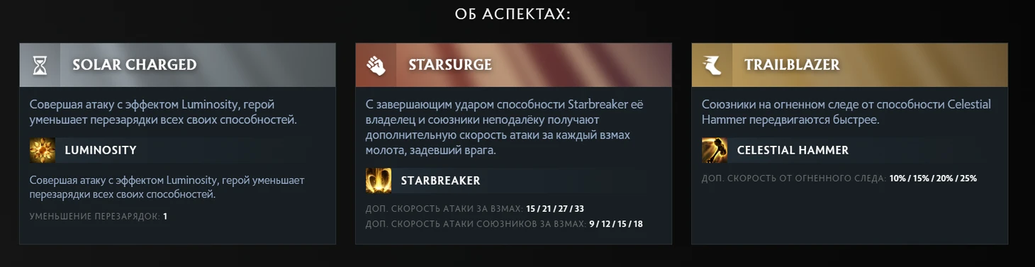 После введения в прошлом году аспектов они появились и в Ability Draft. Причем аспект можно выбрать у каждого героя в лобби, что как будто намекает, что вы можете поменять любую свою способность. Но эта механика не работает. У вас не будет никаких изменений от способностей Dawnbreaker, если вы выберете один из ее аспектов. Почему? Причина неизвестна.