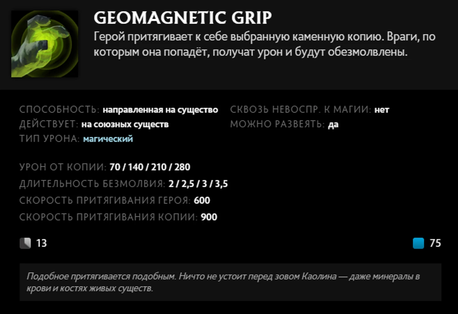 Некоторые очень важные способности привязаны к другим, о чем указано мелким шрифтом в описании, как в договоре с банком. Например, Stone Remnant, камни Earth Spirit, привязаны к Magnetize, его ультимейту. Если вы его не взяли, то у вас половина функциональности Boulder Smash и Rolling Boulder. Geomagnetic Grip вы вообще не сможете использовать, если Шард не купите, так как только с ним можно будет использовать способность и на союзников. Вспоминаем, что радиус Magnetize всего 350, и понимаем, что на саппорте его не взять, так как придется заходить в центр файта, а на коров можно и что-то интереснее выцепить. Как итог: способности Earth Spirit почти всегда полностью остаются на столе и никто их не берет.