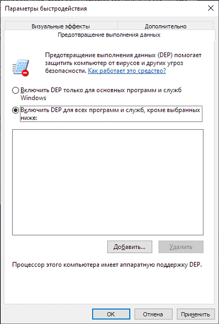 Выберите вкладку Предотвращение выполнения данных и переключите кнопку, как указано на скриншоте. Нажмите Применить, потом ОК и перезагрузите компьютер