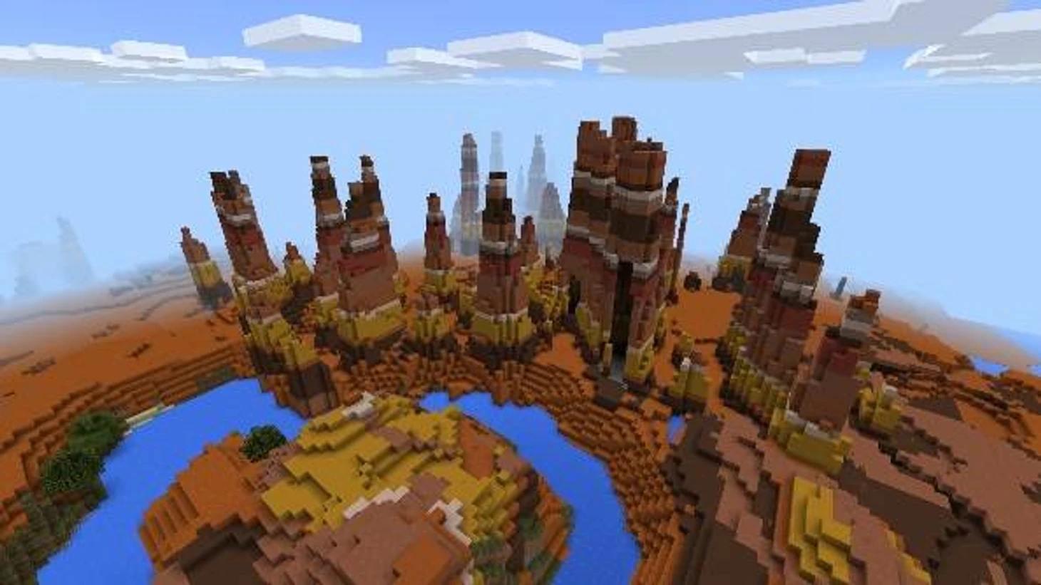 Один из самых красивых сидов в игре! Как только вы появитесь на спауне этого биома, развернитесь и увидите обожженную глину — пройдите вперед. Пройдя некоторое расстояние, вы увидите красивые горы из разных видов глины огромного размера и высоты.