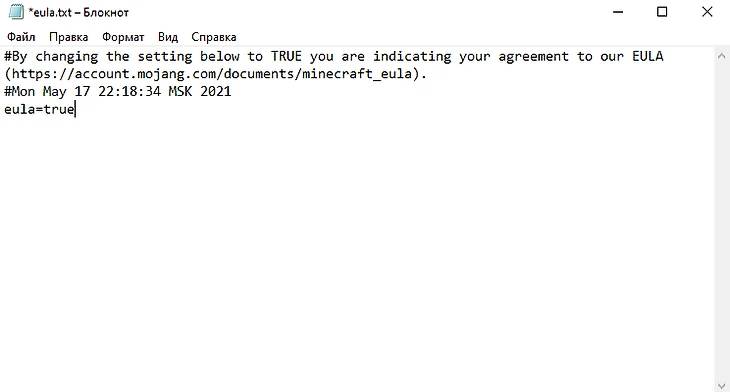 Далее открываем файл eula.txt и в последней строчке меняем значение «false» на «true». Сохраняем файл.