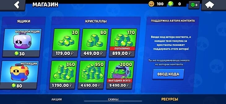 Поле для ввода промокодов спрятано в магазине Бравл Старс. Пролистайте ассортимент магазине до конца, и вы увидите кнопку «Ввод кода».