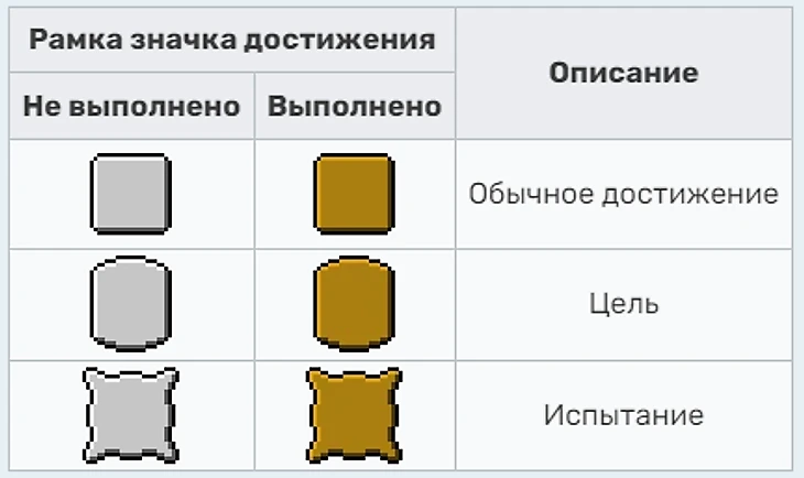 Каждый тип достижений имеет разную рамку и цвет в зависимости от выполнения задания.