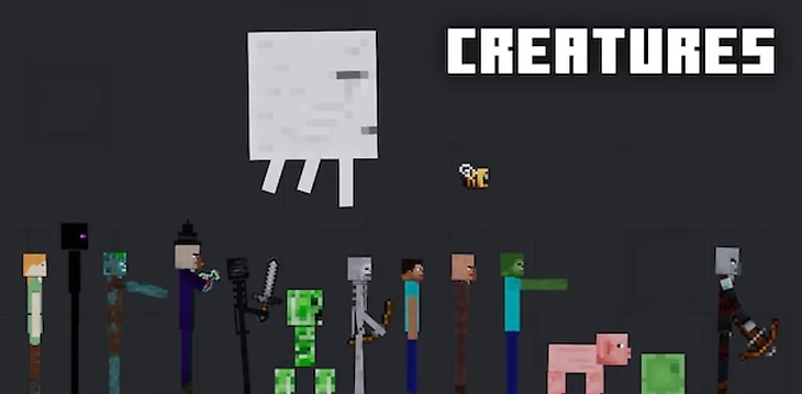 Достаточно большая модификация, включающая в себя дополнения, которые устанавливаются отдельно. В основном в пак входят большинство персонажей из Minecraft, монстры, оружие, постройки и многое другое. В последнем обновлении было добавлено и исправлено: