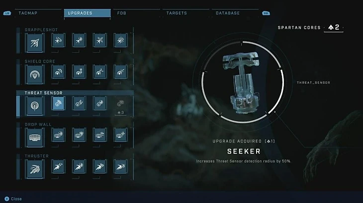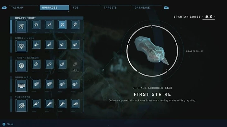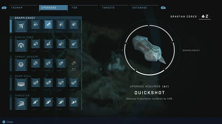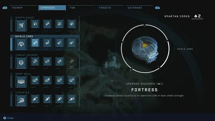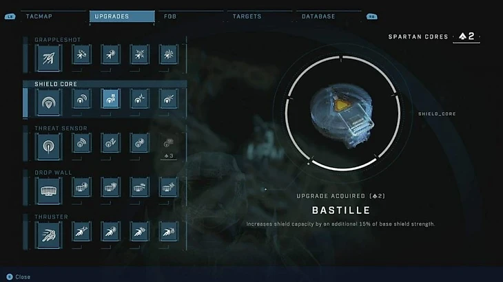 Апгрейды открываются с помощью спартанских ядер, разбросанных по миру игры. Это один из основных коллекционных ресурсов кампании, которые подходят для улучшения всех пяти элементов экипировки: крюка-кошки, ядра щита, датчика угрозы, стены и ускорителя.