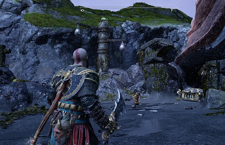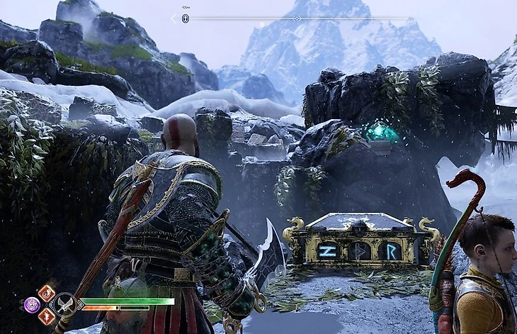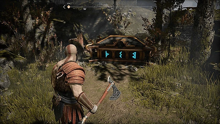 Над сундуком есть точка, сюда нужно переместить ветра. Столбы с рунами будут слева, справа и на скалах. Благодаря Ветрам Хель руны начнут меняться. Необходимо забрать руны своевременно и вернуть в точку над сундуком. Когда сделаете все три руны – сундук откроется.