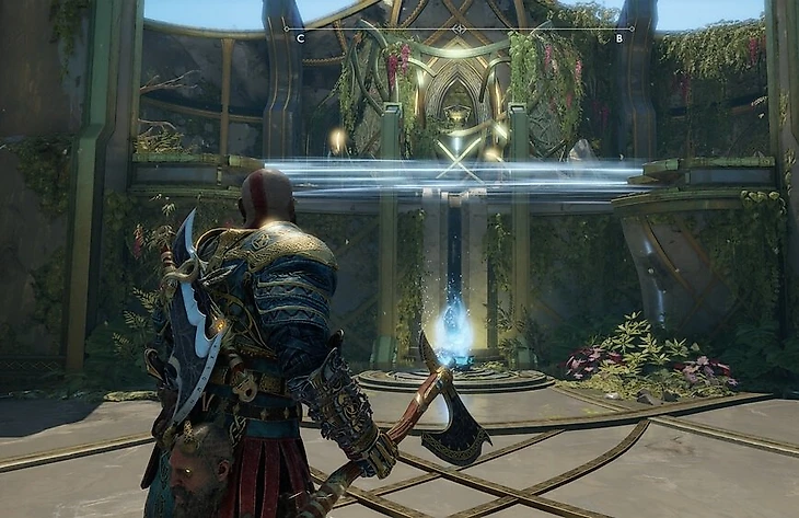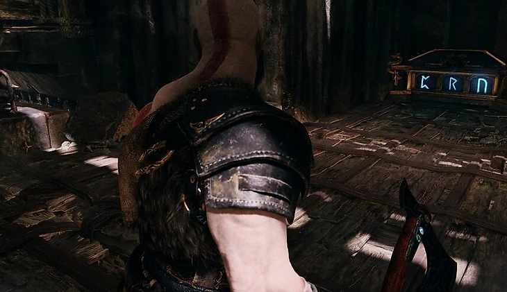 Приблизительно по центру между сундуком и аркой есть столбы с рунами. Руна В смотрит вправо (первый рычаг) и вверх (второй рычаг). Двиньте Ветер Хель на нижний рычаг (руны начнут меняться) и возьмите его назад, когда руна поменяется на В, смотрящую вверх.