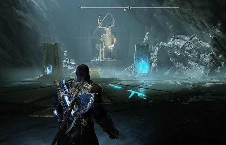 Идите к площадке с телом Мимира, оттуда вниз на горный склон. Зайдите внутрь соседней горы.