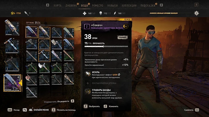 Dying Light 2 пошла путем оригинала и не стала внедрять огнестрельное оружие. Из дальнобойного есть лишь лук, который по-прежнему вносит некий дисбаланс, но хотя бы появляется во второй половине игры. Остальное оружие сугубо заточено под ближний бой – и это прекрасно! Вас ждет куча молотов, мачете и топоров, и сражаться ими одно удовольствие. Хоть рубить мертвецов, отсекать конечности и разбивать мозги весьма весело, но через 2-3 часа хочется большего. Разработчики учли настроения игроков и создали систему апгрейдов. В ней вы в любой удобный момент цепляете на любимый молот модификации, которые заставят мертвеца загореться или же пронзят его электричеством. И это лишь парочка примеров.