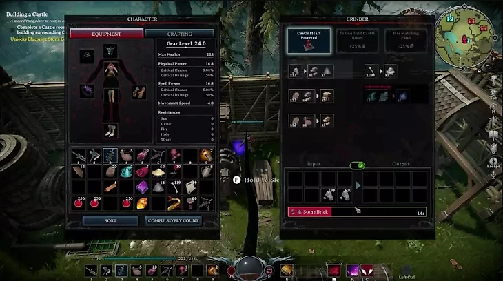 В учебнике у вас должны быть построены рабочее место, гроб и Сердце замка, а также другие важные предметы, которые вы будете часто использовать. Stone Bricks – один из основных ресурсов, который вам понадобится, особенно при строительстве Сердца замка, но как этого добиться, не объясняется.