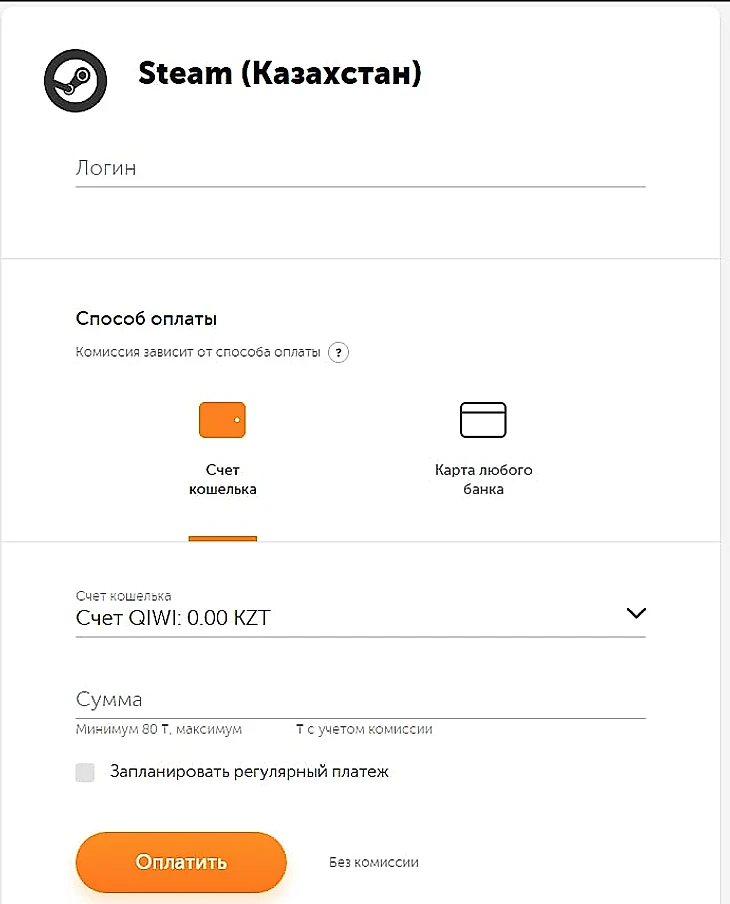 Кошелек Steam можно пополнить через Qiwi, но через тенге (казахская валюта). Способ действительный в момент написания статьи (утро 3-го марта).