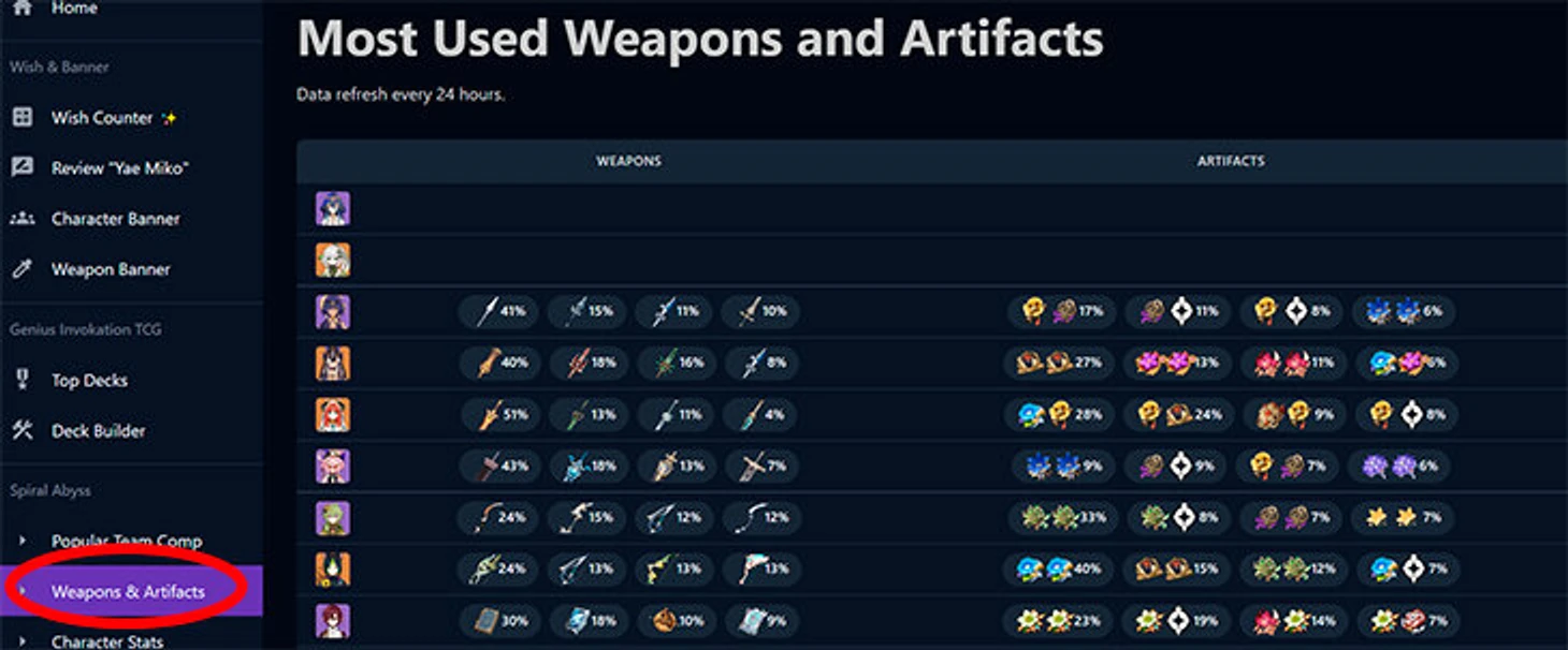 На вкладке «Weapons & Artifacts» информация о самых популярных сборках артефактов и оружия под конкретных персонажей для Бездны. Поэтому если у вас нет пятизвездочного оружия, на этой вкладке можно узнать, чем эффективнее его заменить.