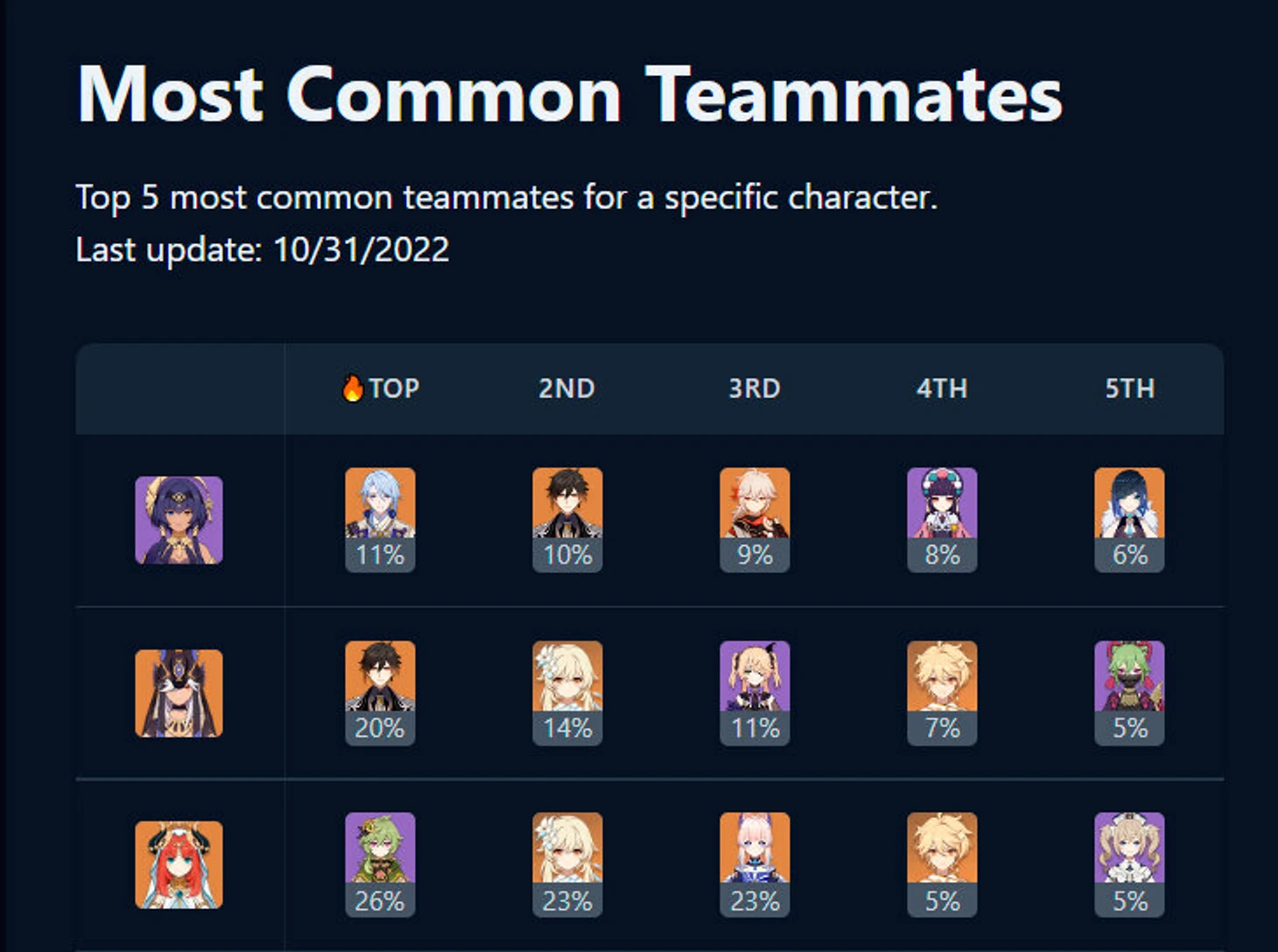 Чуть правее расположена подборка по героям. Здесь вы можете посмотреть, с кем чаще всего играют определенные персонажи. Она будет полезна в том случае, если у вас нет метовых Кадзухи, Райден, Чжун Ли и других.