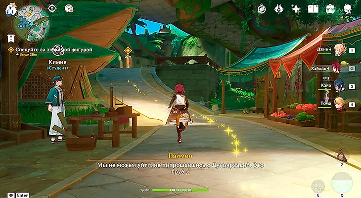 Нахида предложит поговорить с торговцами, с которыми вы раньше общались на празднике. Амал и Кимия не скажут ничего дельного, поэтому поговорите с Дэхьей и Дуньярзадой.