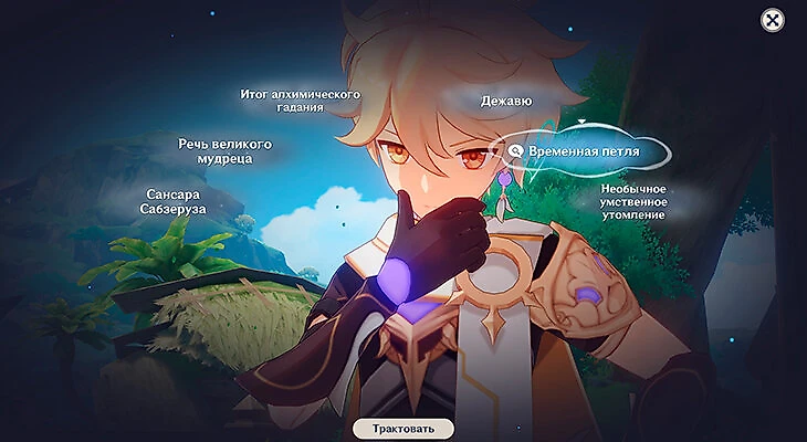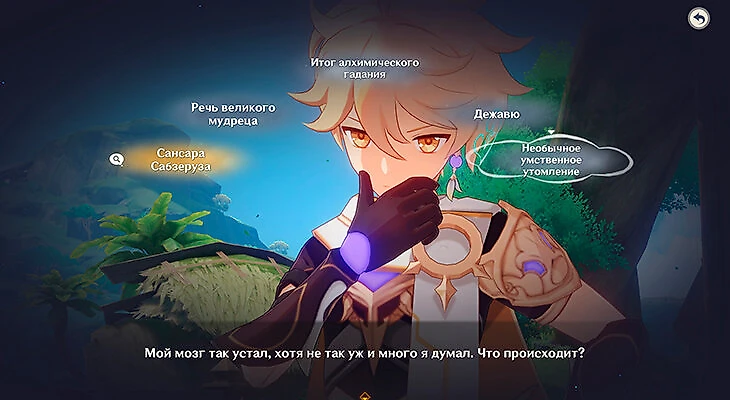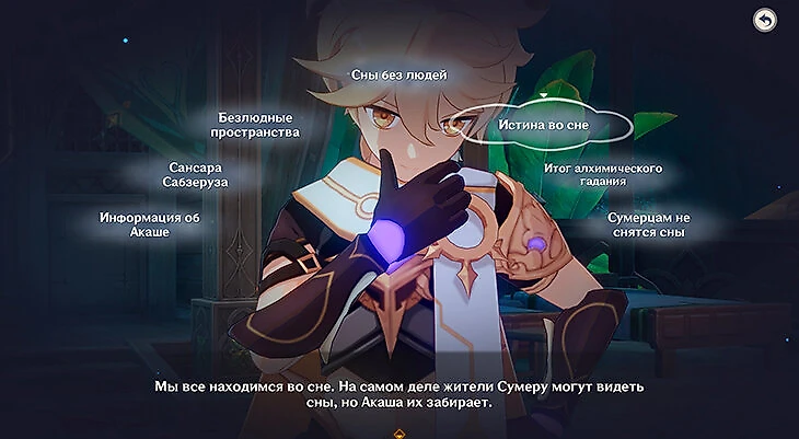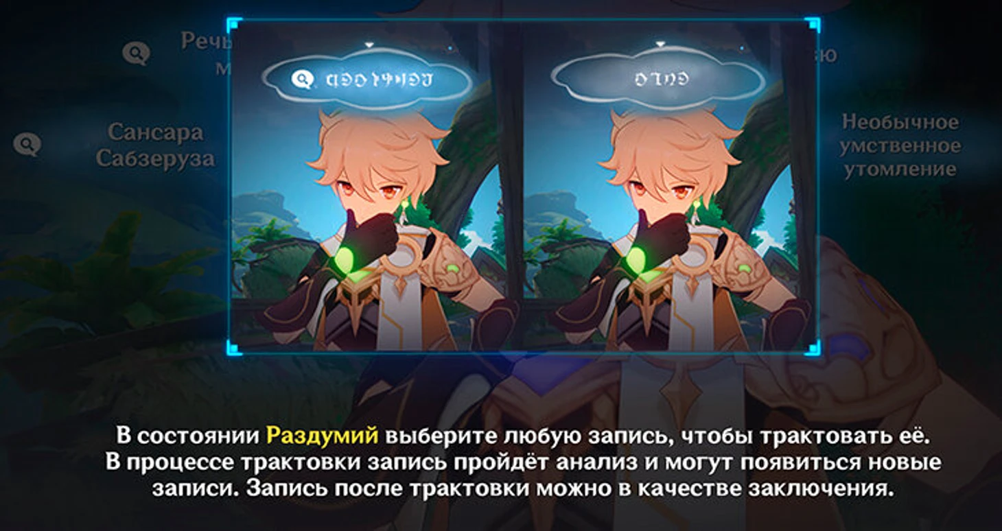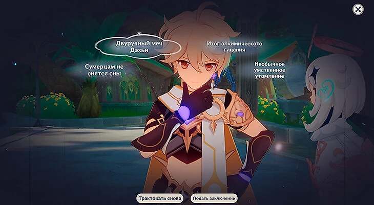 Нахида даст возможность самостоятельно подумать над произошедшим. В режиме раздумий прочитайте все надписи и сопоставьте те, которые подходят друг другу по смыслу, чтобы открылись новые записи. После прочтения новых записей выберите наиболее подходящую под ситуацию и нажмите «Подать заключение».