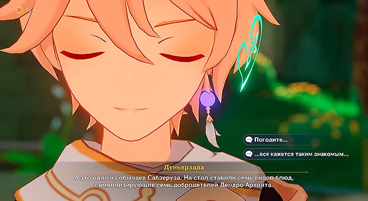Поговорите с «Дуньярзад». От девушки осталась одна лишь оболочка. Тогда Путешественник расстроится и пойдет смотреть на танец. Он заметит, что с речью Нилу что-то не так, и зацепится за падисары – в реальном мире их нет, но фантазия додумывает во сне несуществующие детали. Так вы поймете, что находитесь во сне Нилу.