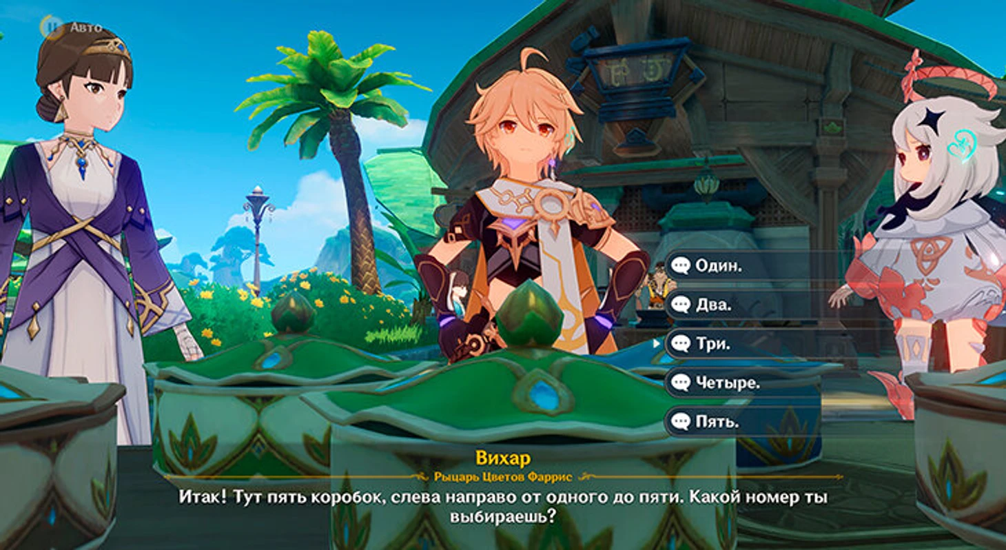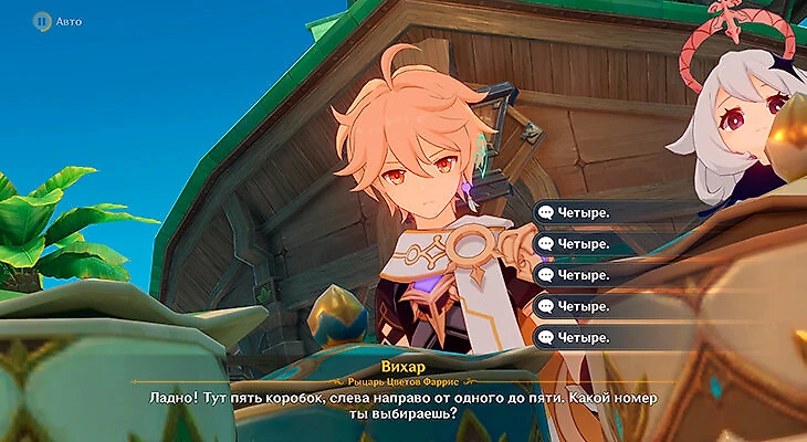 Один из торговцев предложит погадать, в какой коробке сладости, а в какой – гадости. Паймон хочет сладкое с закатниками, они в четвертой коробке.