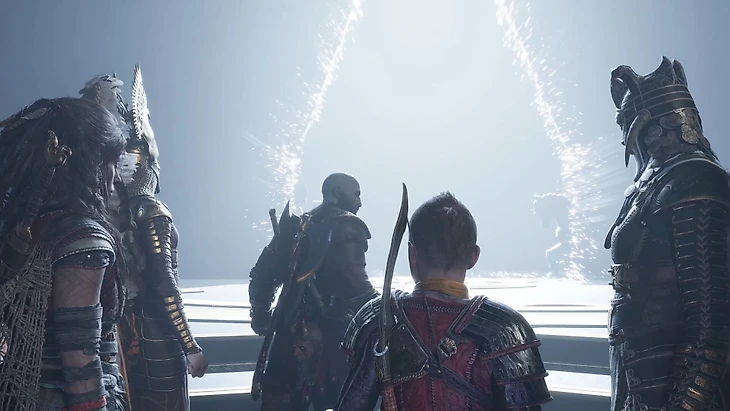 Тюр приходит на помощь и вытаскивает Кратоса и Атрея из воды. Выходим из храма и направляемся к мистическим вратам. Но не спешите расслабляться – далее увидите катсцену, по итогам которой ваш путь до врат увеличится в разы. На деле ничего сложного – по пути отбиваемся от эльфов и бежим за Тюром и Атреем.